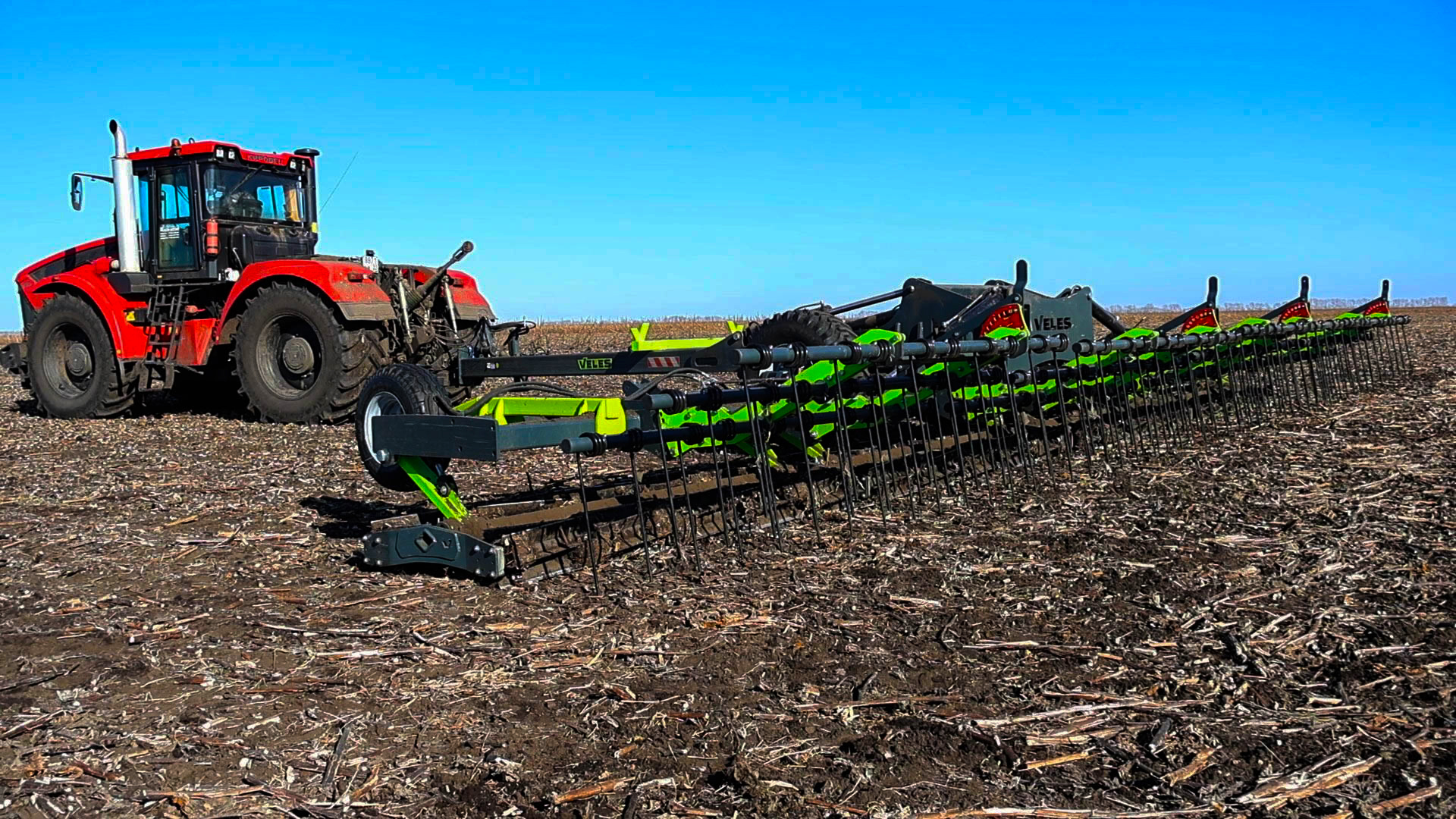 - Если мы работаем после уборки, то ножевые катки мульчируют растительную массу, а пружинные зубья равномерно ее распределяют, создавая условия для исключения зон неоднородностей в плане возврата питательных элементов в почву.